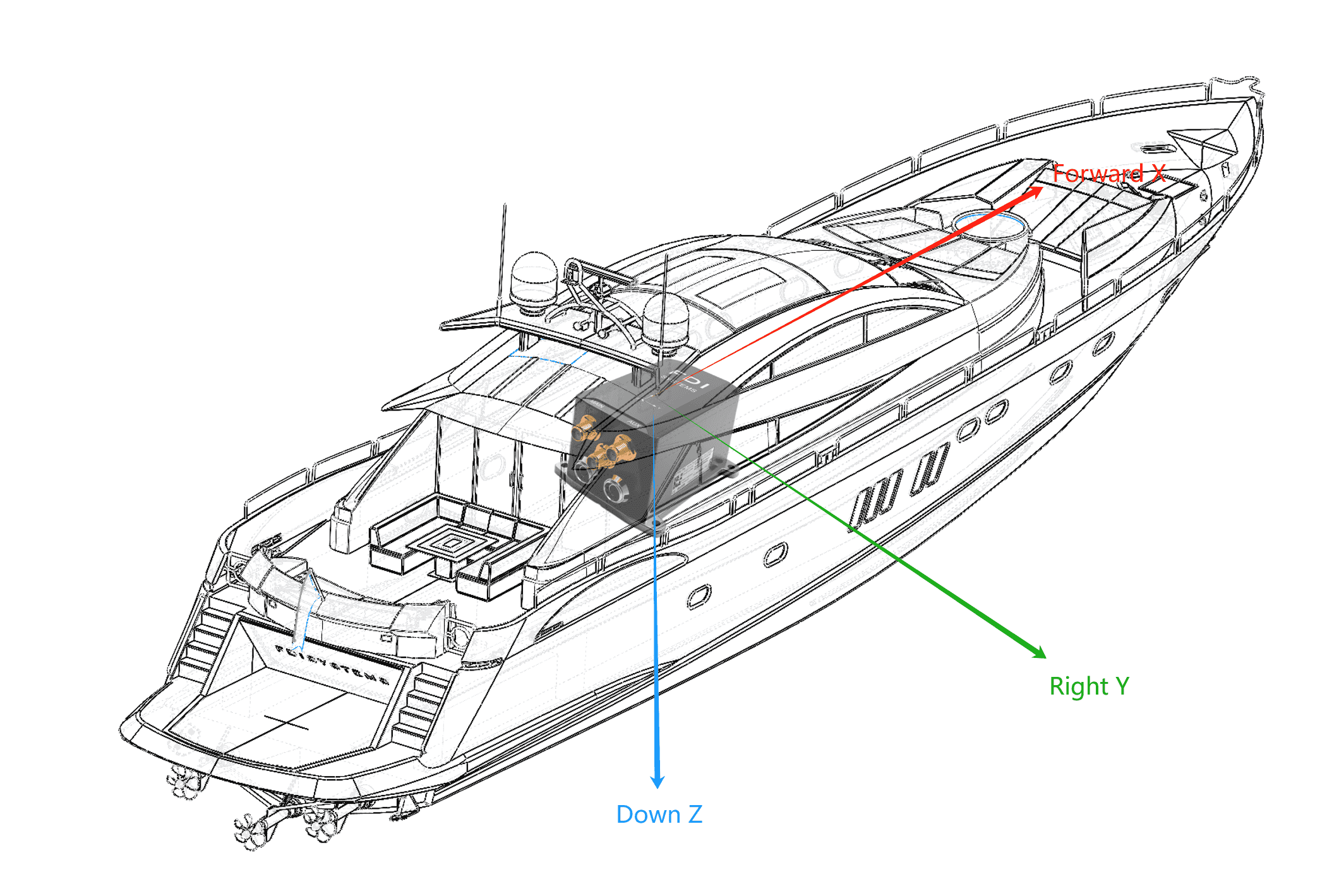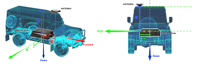 图17和图18中显示了具有标记轴的示例安装。在此安装中,将有一个正X轴天线偏移值、一个正Y轴天线偏移值和一个负Z轴偏移值。