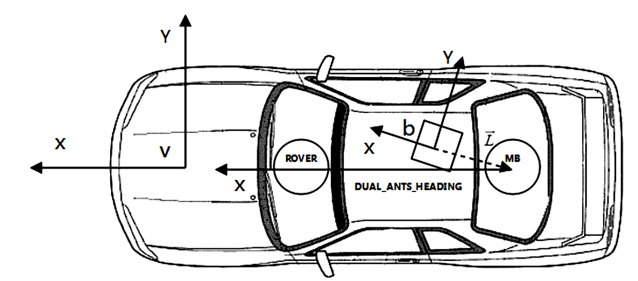 辅助天线应直接安装在主天线的前面,尽可能保持距离。距离越远,定向精度就越高。请参见图19,例如安装在汽车上。如果无法将辅助天线直接安装在主天线前面,则可以安装在另一个位置。在这种情况下,必须准确地测量双天线航向偏移并在上位机软件的参数表中进行配置,请参见第10.10.2节。